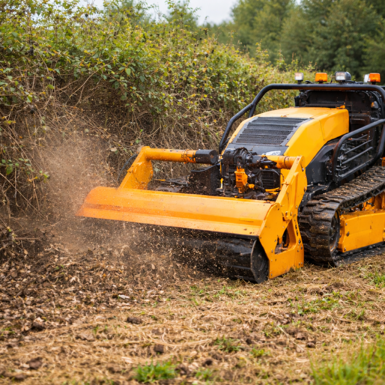 Mulchen von verwilderten Flächen, Brombeeren, Gestrüpp und Jungwuchs.